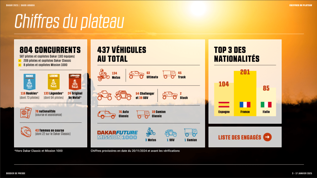 Il est reconduit à côté de Bisha, une ville de 200 000 habitants située dans le quart sud-ouest de l’Arabie Saoudite, que la grande majorité des concurrents atteindront après avoir récupéré leurs véhicules au port de Jeddah. Les retrouvailles se tiendront au tournant de l’année 2025, dont le commencement sera consacré à la finalisation des vérifications techniques et administratives ainsi qu’aux tout derniers préparatifs. Dans une atmosphère d’oasis…
