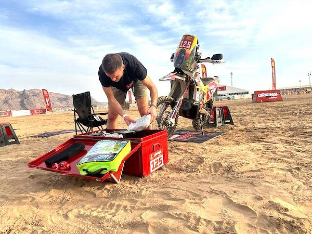 D’autres adhèrent au projet. « J’ai embarqué tout le monde dans l’aventure, des gens qui croient en moi et sans qui rien n’aurait été faisable. C’est vraiment l’une des plus belles choses de cette histoire. » Alors qu’il déballe sa moto et y installe road book et GPS fournis par l’organisation, le pilote de la KTM numéro 125 prend le temps de tourner une petite vidéo avec son smartphone qu’il poste sur son groupe WhatsApp. « J’y partage mon quotidien avec tous ceux qui m’aident et me soutiennent. » Son premier Dakar, qui n’est que son quatrième rallye-raid, Damien veut l’aborder avec sagesse. Il sait pour cela qu’il devra maîtriser son tempérament de compétiteur : « J’ai des amis qui y ont déjà participé, et comme on a le même niveau de pilotage, j’avais commencé à me projeter dans le classement. Mais après deux grosses frayeurs à Abou Dhabi, je me suit qu’il fallait que je me calme, et qu’il n’y avait rien à gagner en pensant au résultat.