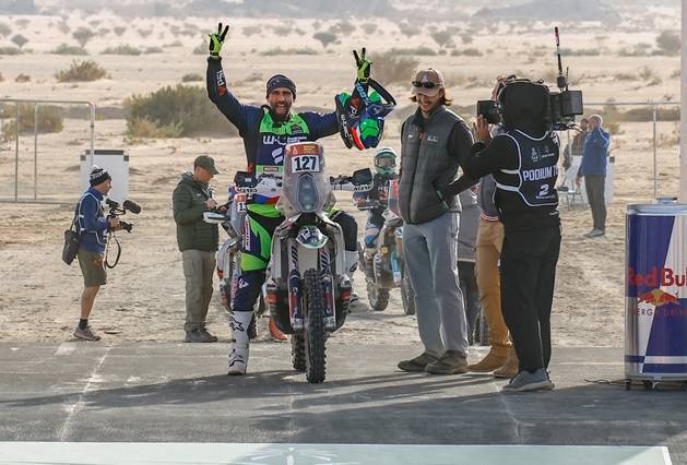 La chute, c’est à la fois le cœur du problème et la force d’Adam, qui a développé une réelle science de la gamelle depuis son adolescence. « Je crois que je suis tombé une vingtaine de fois depuis le début du Dakar, analyse méthodiquement le cascadeur. Parfois je roule à mon rythme, et soudainement je heurte une pierre qui me projette en l’air, ça se joue à vingt centimètres. Mais je crois que je sais bien comment tomber, de quelle façon me positionner pour ne pas me faire mal. En réalité on n’a pas le temps de réfléchir, mais c’est inscrit dans mon logiciel mental personnel : je vole, et finalement je sais quoi faire ». Jusqu’ici, la recette fonctionne. La moto #127 et son pilote ont rejoint le bivouac tous les soirs, et même à une honorable 45e place, qui est aussi celle de quatrième débutant. L’homme qui tombe à pic ne veut pas regarder le classement, mais est animé d’une confiance absolue quant à ses chances de voir l’arrivée finale à Shubaytah : « Je suis certain à 100 % que j’y serai, parce que je sais pourquoi je me réveille tous les matins même quand c’est dur ».