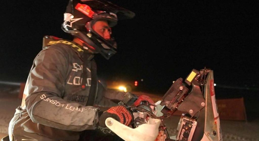 Il était près de 20h00 lorsque Badr Alhamdan s’est pointé à l’arrivée de la neuvième étape du rallye. Dernier pilote moto à rejoindre le refuge de la seconde étape marathon tracée entre Wadi Ad Dawasir et Bisha, le Saoudien ne cachait pas sa satisfaction d’avoir vaincu les dunes à la nuit tombée. « Un truc magnifique qui semblait sans fin », glissait-il, tout aussi heureux d’avoir surmonté les problèmes mécaniques qui l’ont contraint à bricoler son moteur durant plus de trois heures. « J’ai dû le démonter pour régler les soupapes et remettre de l’huile qu’un ami a pu m’apporter, poursuit le pilote de la Kove numéro 83. C’est ce qui a fait que j’ai attaqué les dunes à la nuit tombée. »